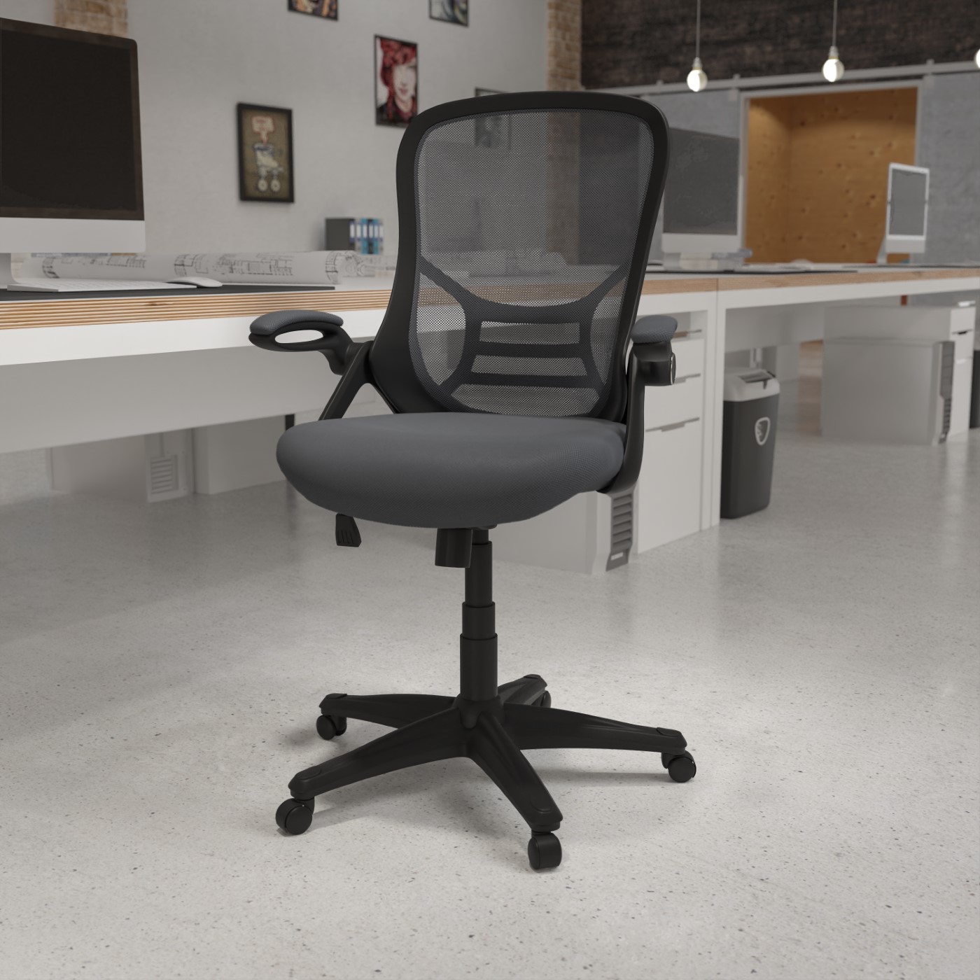 HIGH BACK DARK GRAY MESH ERGONOMIC SWIVEL OFFICE CHAIR WITH BLACK FRAME AND FLIP-UP ARMS