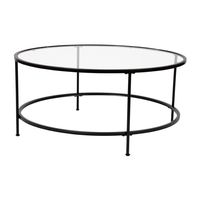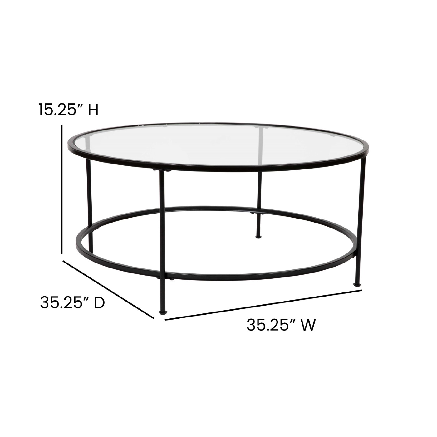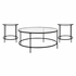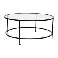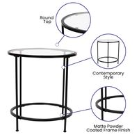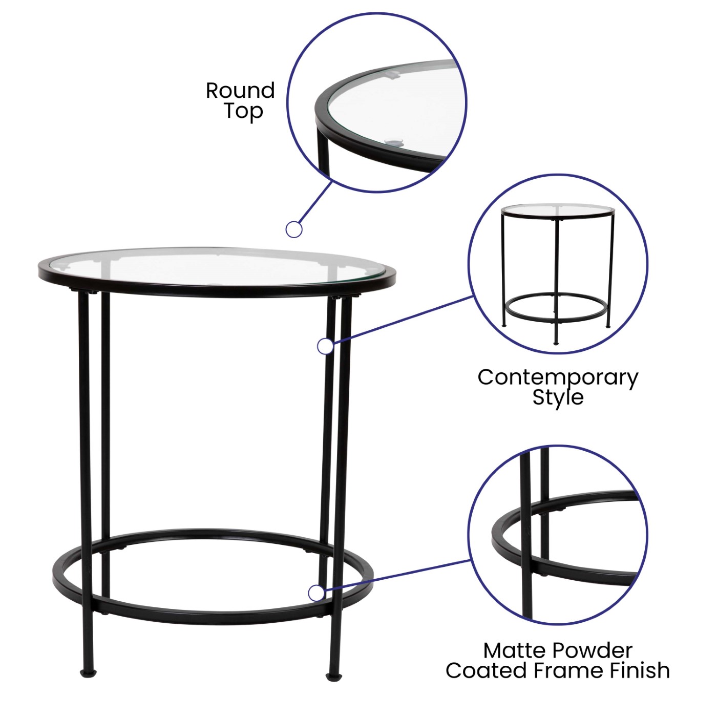 ASTORIA COLLECTION COFFEE AND END TABLE SET - CLEAR GLASS TOP WITH ROUND MATTE BLACK FRAME - 3 PIECE OCCASIONAL TABLE SET