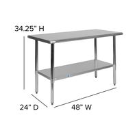 STAINLESS STEEL 18 GAUGE PREP AND WORK TABLE WITH UNDERSHELF - NSF CERTIFIED - 48"W X 24"D X 34.5"H: FREE SHIPPING!