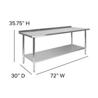 STAINLESS STEEL 18 GAUGE PREP AND WORK TABLE WITH 1.5" BACKSPLASH AND UNDERSHELF - NSF CERTIFIED - 72"W X 30"D X 36"H