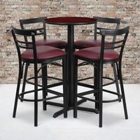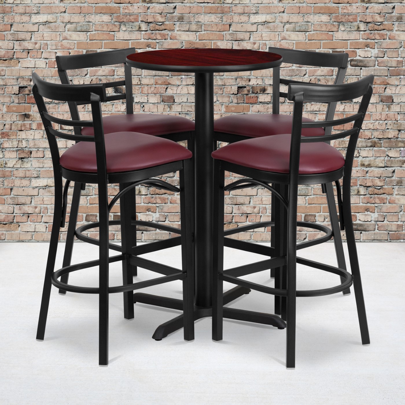 24'' ROUND MAHOGANY LAMINATE TABLE SET WITH X-BASE AND 4 TWO-SLAT LADDER BACK METAL BARSTOOLS - BURGUNDY VINYL SEAT