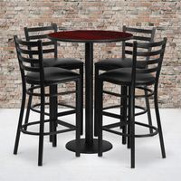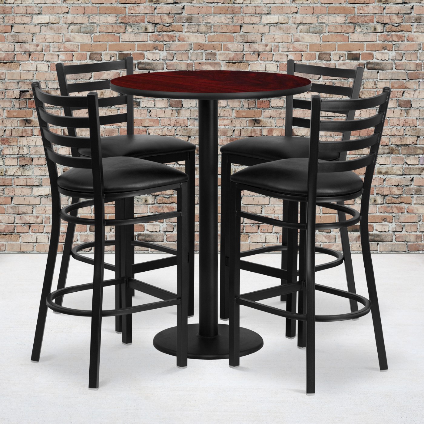 30'' ROUND MAHOGANY LAMINATE TABLE SET WITH ROUND BASE AND 4 LADDER BACK METAL BARSTOOLS - BLACK VINYL SEAT