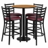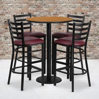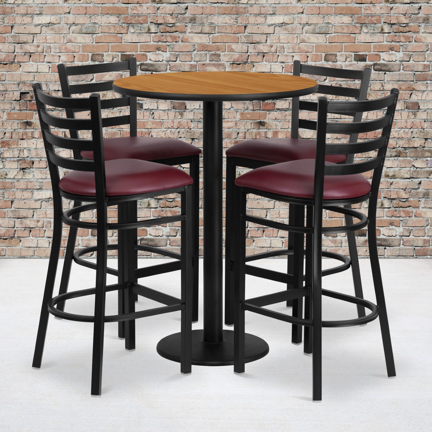 30'' ROUND NATURAL LAMINATE TABLE SET WITH ROUND BASE AND 4 LADDER BACK METAL BARSTOOLS - BURGUNDY VINYL SEAT