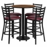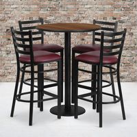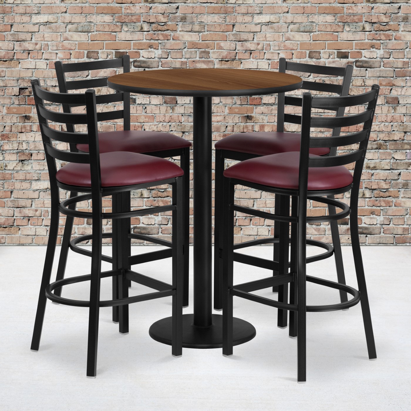 30'' ROUND WALNUT LAMINATE TABLE SET WITH ROUND BASE AND 4 LADDER BACK METAL BARSTOOLS - BURGUNDY VINYL SEAT