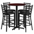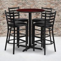 30'' ROUND MAHOGANY LAMINATE TABLE SET WITH X-BASE AND 4 LADDER BACK METAL BARSTOOLS - BLACK VINYL SEAT