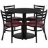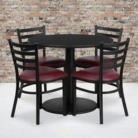 36'' ROUND BLACK LAMINATE TABLE SET WITH ROUND BASE AND 4 LADDER BACK METAL CHAIRS - BURGUNDY VINYL SEAT