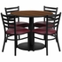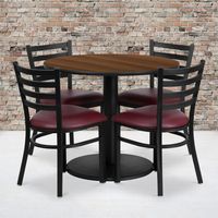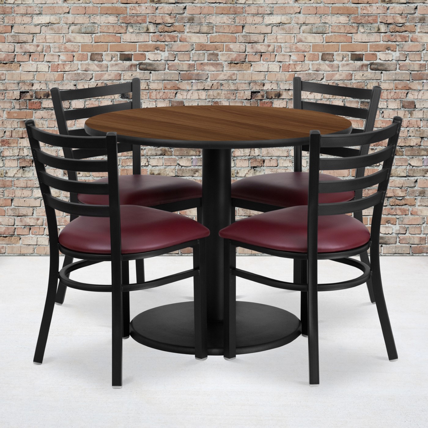 36'' ROUND WALNUT LAMINATE TABLE SET WITH ROUND BASE AND 4 LADDER BACK METAL CHAIRS - BURGUNDY VINYL SEAT