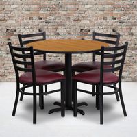 36'' ROUND NATURAL LAMINATE TABLE SET WITH X-BASE AND 4 LADDER BACK METAL CHAIRS - BURGUNDY VINYL SEAT