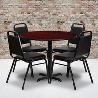 36'' ROUND MAHOGANY LAMINATE TABLE SET WITH X-BASE AND 4 BLACK TRAPEZOIDAL BACK BANQUET CHAIRS FREE SHIPPING!