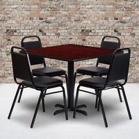 36'' SQUARE MAHOGANY LAMINATE TABLE SET WITH X-BASE AND 4 BLACK TRAPEZOIDAL BACK BANQUET CHAIRS: FREE SHIPPING!