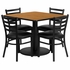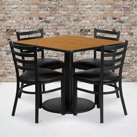 36'' SQUARE NATURAL LAMINATE TABLE SET WITH ROUND BASE AND 4 LADDER BACK METAL CHAIRS - BLACK VINYL SEAT: FREE SHIPPING!