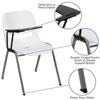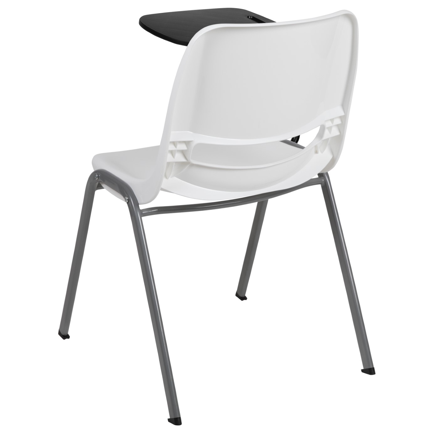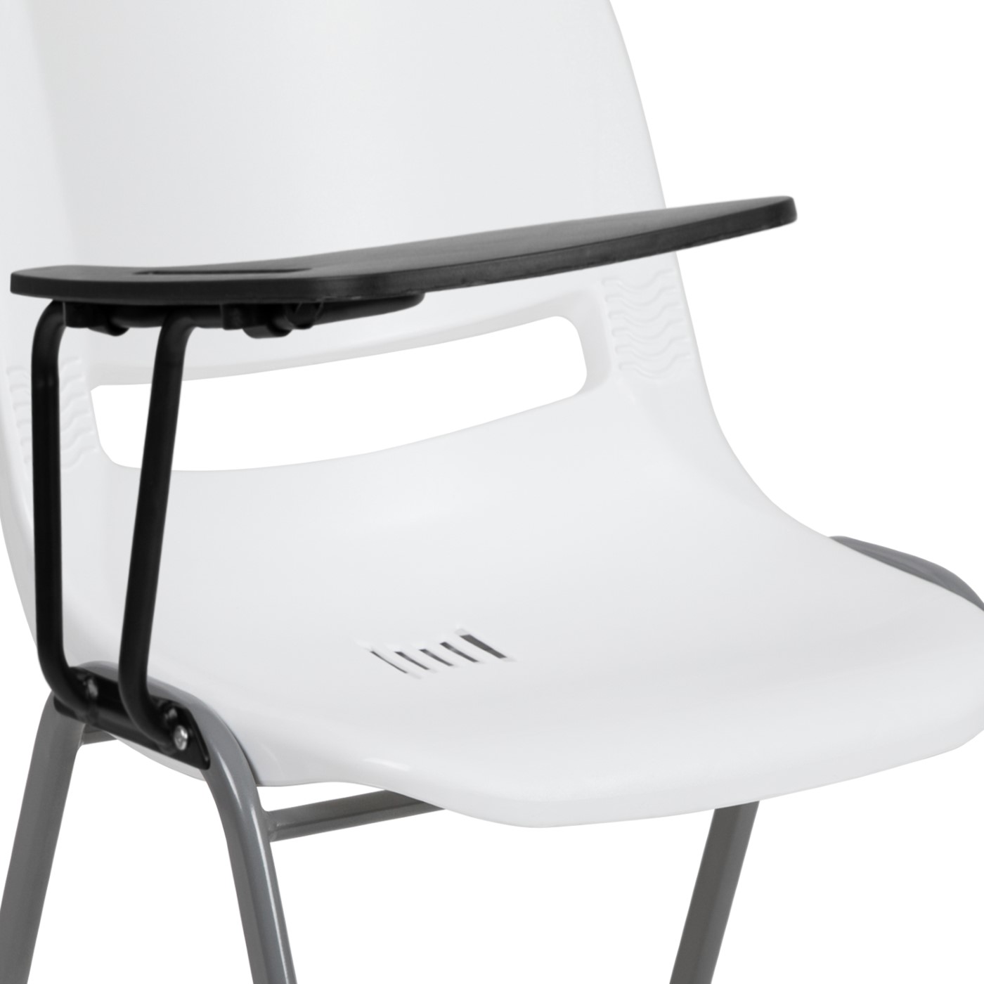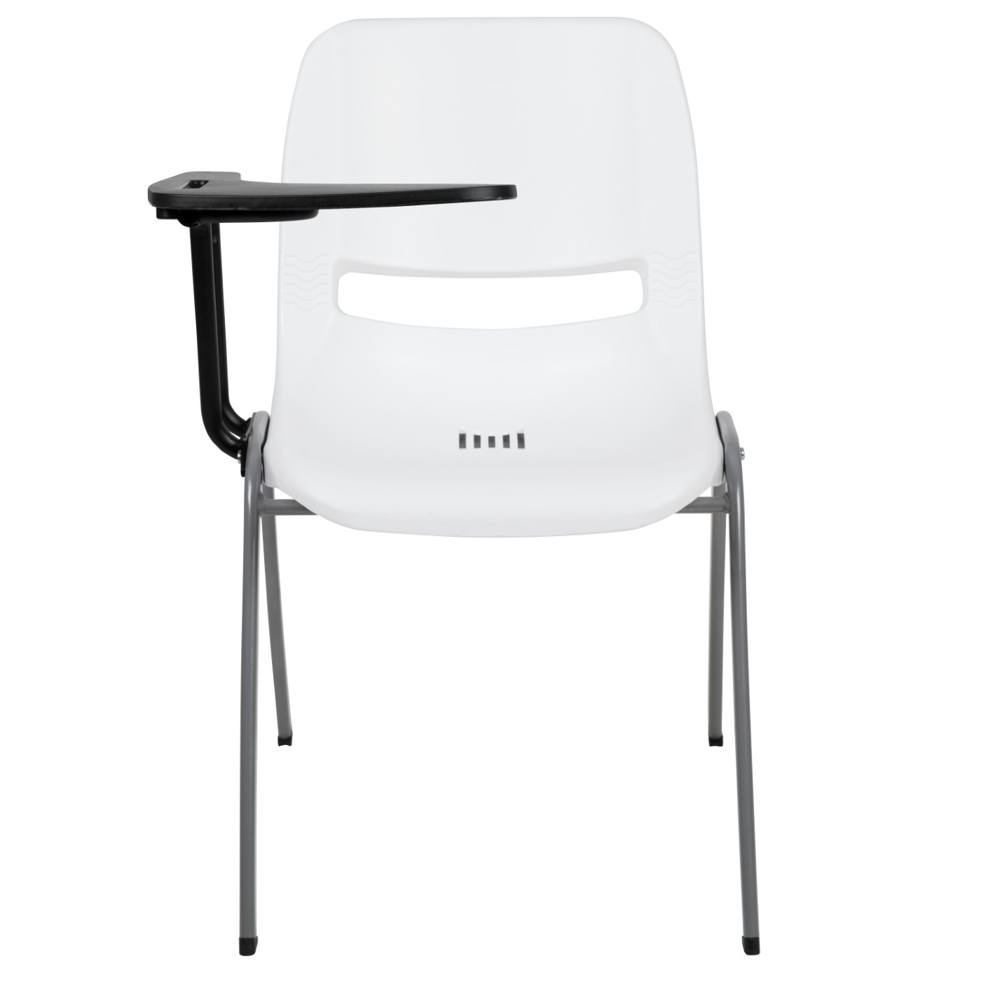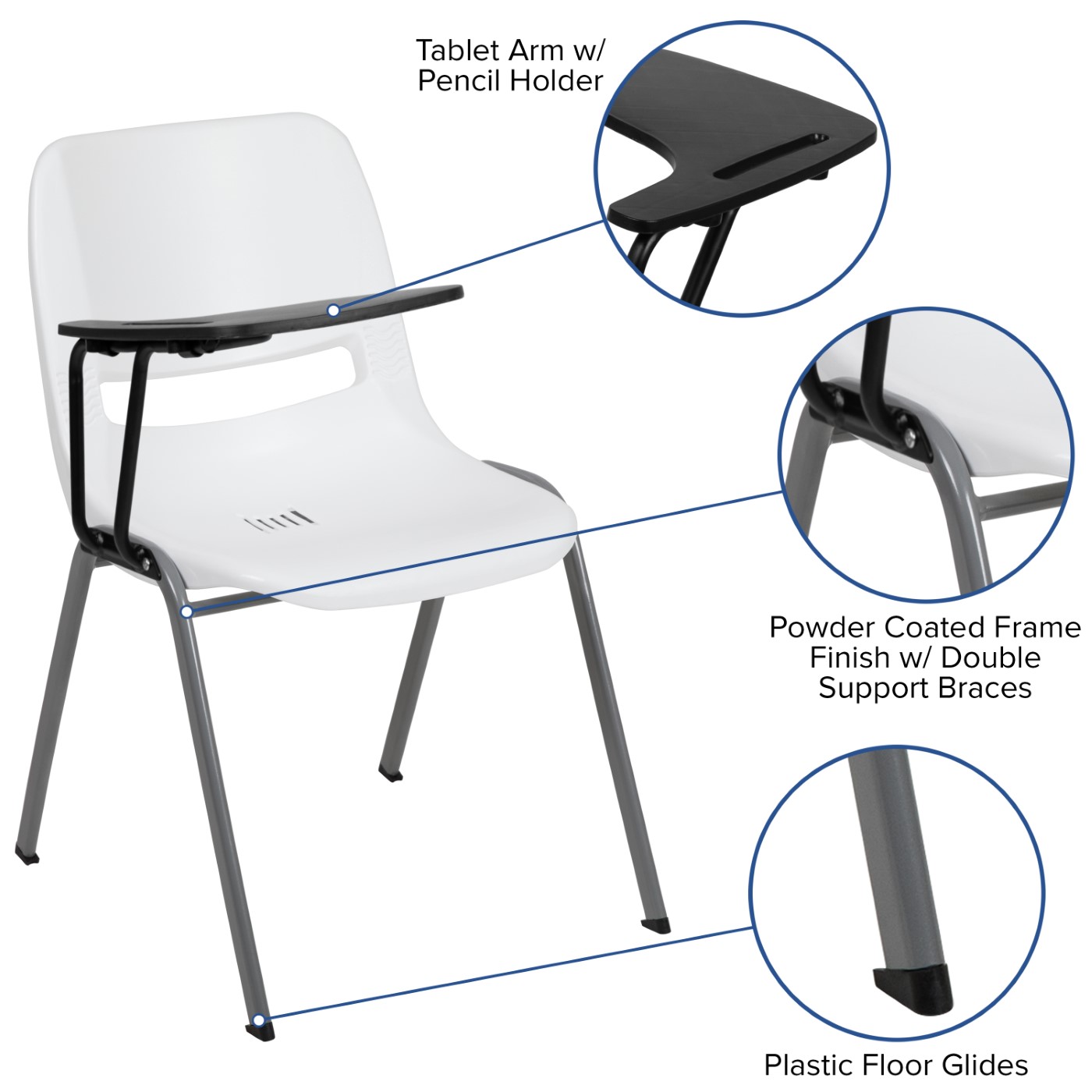 WHITE ERGONOMIC SHELL CHAIR WITH RIGHT HANDED FLIP-UP TABLET ARM