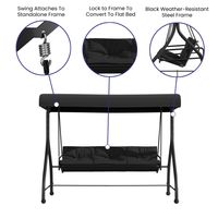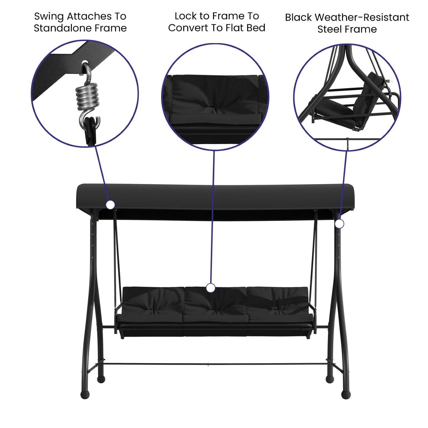3-SEAT OUTDOOR STEEL CONVERTING PATIO SWING CANOPY HAMMOCK WITH CUSHIONS / OUTDOOR SWING BED (BLACK)
