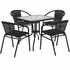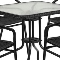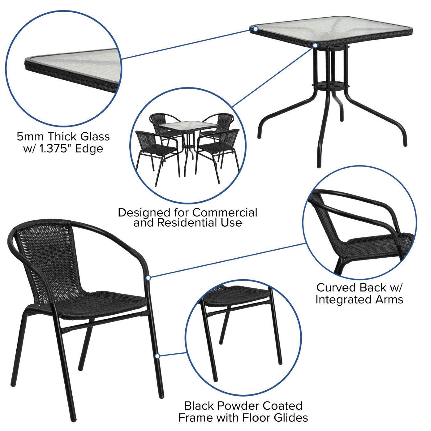 28'' SQUARE GLASS METAL TABLE WITH BLACK RATTAN EDGING AND 4 BLACK RATTAN STACK CHAIRS: FREE SHIPPING!