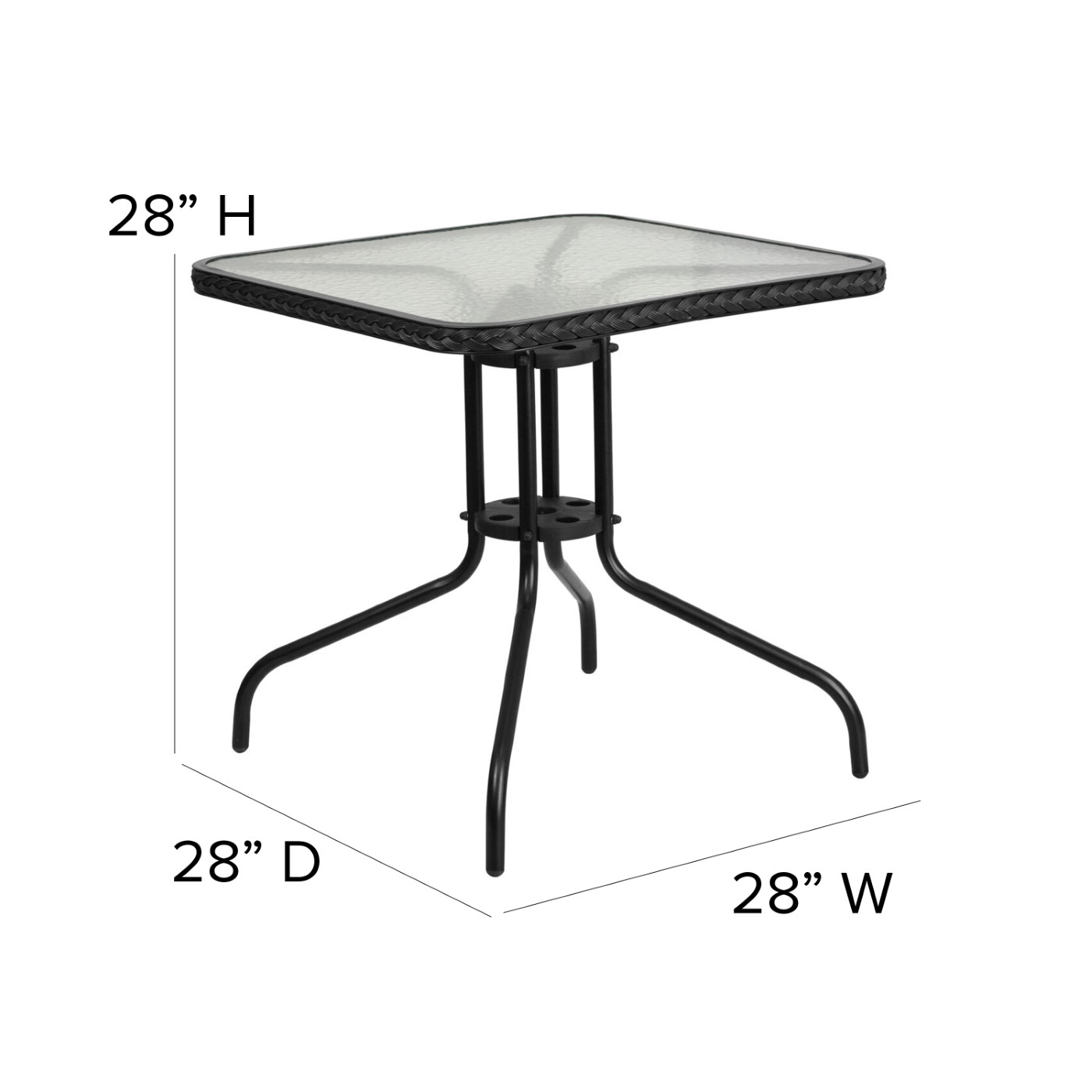 - Square Table: Top Size: 28" Square, 5mm Thick Glass, 1.375" Edge Top, Decorative Black Rattan Edge Band