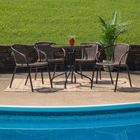 28'' ROUND GLASS METAL TABLE WITH DARK BROWN RATTAN EDGING AND 4 DARK BROWN RATTAN STACK CHAIRS: FREE SHIPPING!