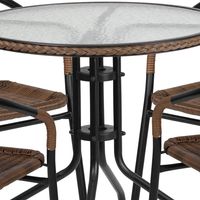 28'' ROUND GLASS METAL TABLE WITH DARK BROWN RATTAN EDGING AND 4 DARK BROWN RATTAN STACK CHAIRS