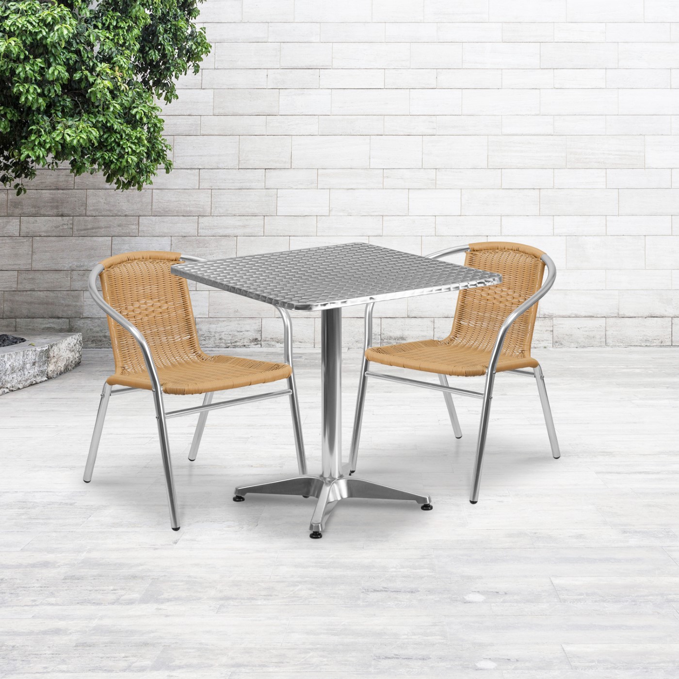 27.5'' SQUARE ALUMINUM INDOOR-OUTDOOR TABLE SET WITH 2 BEIGE RATTAN CHAIRS: FREE SHIPPING!