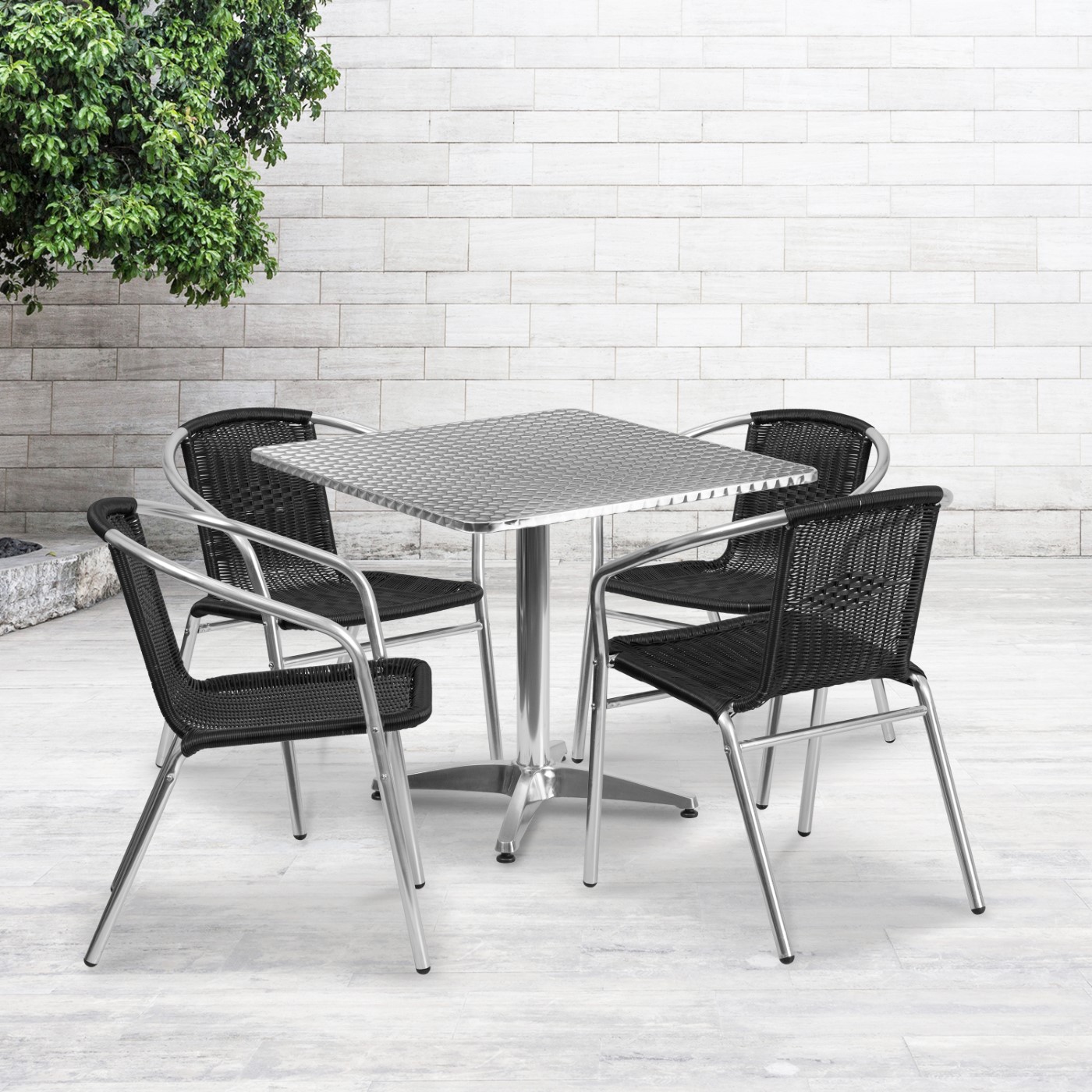 31.5'' SQUARE ALUMINUM INDOOR-OUTDOOR TABLE SET WITH 4 BLACK RATTAN CHAIRS