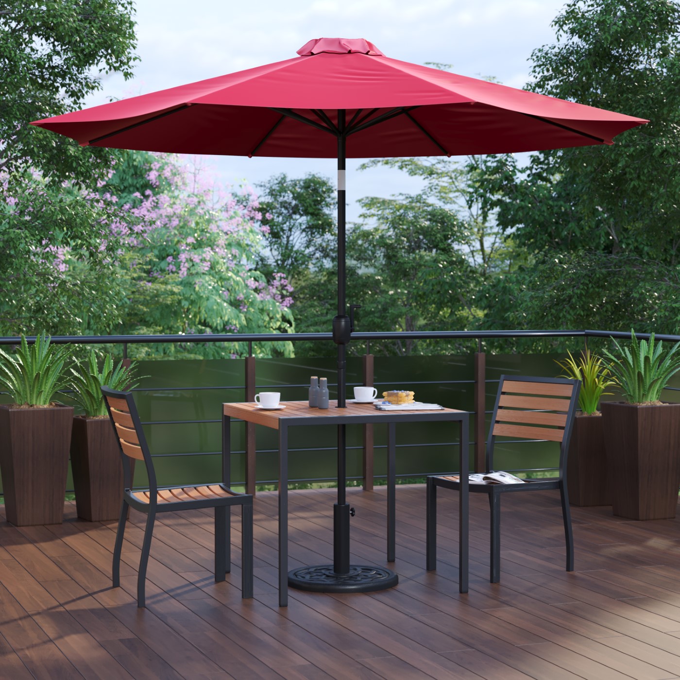 - All-Weather Faux Teak Patio Table & 2 Chair Set with Umbrella and Base