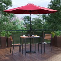 5 PIECE ALL-WEATHER DECK OR PATIO SET WITH 2 STACKING FAUX TEAK CHAIRS, 35" SQUARE FAUX TEAK TABLE, RED UMBRELLA & BASE FREE SHIPPING!