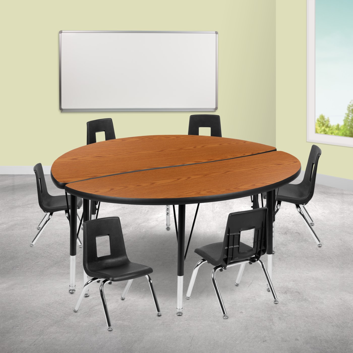 47.5" CIRCLE WAVE FLEXIBLE LAMINATE ACTIVITY TABLE SET WITH 12" STUDENT STACK CHAIRS, OAK/BLACK: FREE SHIPPING!