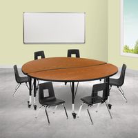 MOBILE 60" CIRCLE WAVE FLEXIBLE LAMINATE ACTIVITY TABLE SET WITH 12" STUDENT STACK CHAIRS, OAK/BLACK