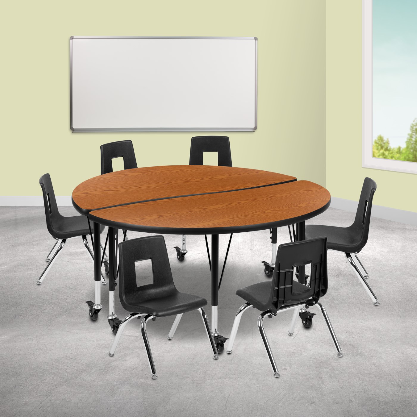MOBILE 47.5" CIRCLE WAVE FLEXIBLE LAMINATE ACTIVITY TABLE SET WITH 14" STUDENT STACK CHAIRS, OAK/BLACK FREE SHIPPING!
