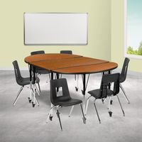 MOBILE 76" OVAL WAVE FLEXIBLE LAMINATE ACTIVITY TABLE SET WITH 16" STUDENT STACK CHAIRS, OAK/BLACK