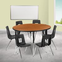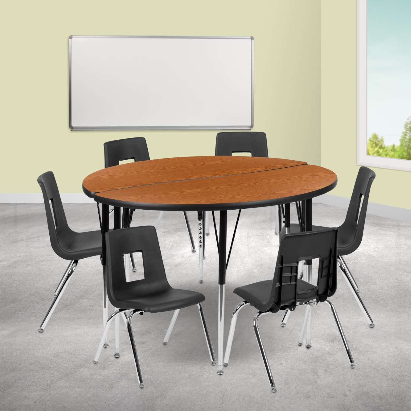 47.5" CIRCLE WAVE FLEXIBLE LAMINATE ACTIVITY TABLE SET WITH 16" STUDENT STACK CHAIRS, OAK/BLACK
