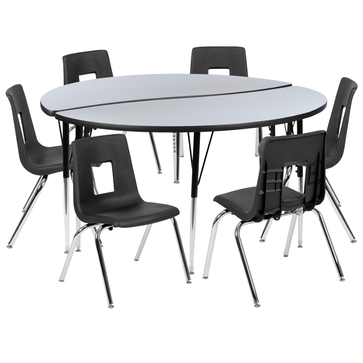 60" CIRCLE WAVE FLEXIBLE LAMINATE ACTIVITY TABLE SET WITH 16" STUDENT STACK CHAIRS, GREY/BLACK FREE SHIPPING!