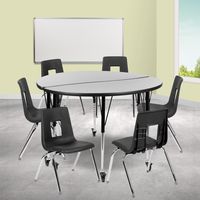 MOBILE 47.5" CIRCLE WAVE FLEXIBLE LAMINATE ACTIVITY TABLE SET WITH 18" STUDENT STACK CHAIRS, GREY/BLACK FREE SHIPPING!