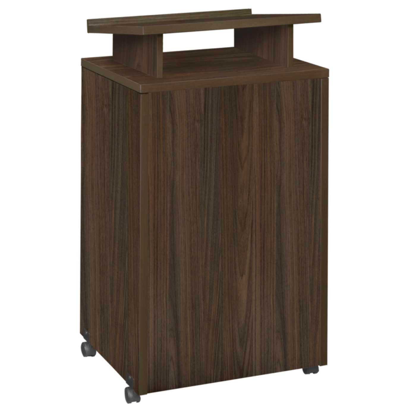 This freestanding lectern moves on four casters and can be conveniently placed anywhere in any room. A podium shelf is angled towards the speaker and has a raised edge along the bottom to keep reference material in place. There are two fixed shelves on the back of the lectern to keep supplies or personal items out of view of the audience. Finished in a classic Neo Walnut laminate, this lectern coordinates with the rest of the conference collection. The collection is constructed of a 1-inch-thick thermal fused melamine laminate with a 3-millimeter commercial grade matching PVC edge. Laminates are scratch, stain and scald resistant. Casegoods are backed by a 10-year limited manufacturer's warranty.Features for your benefit:
