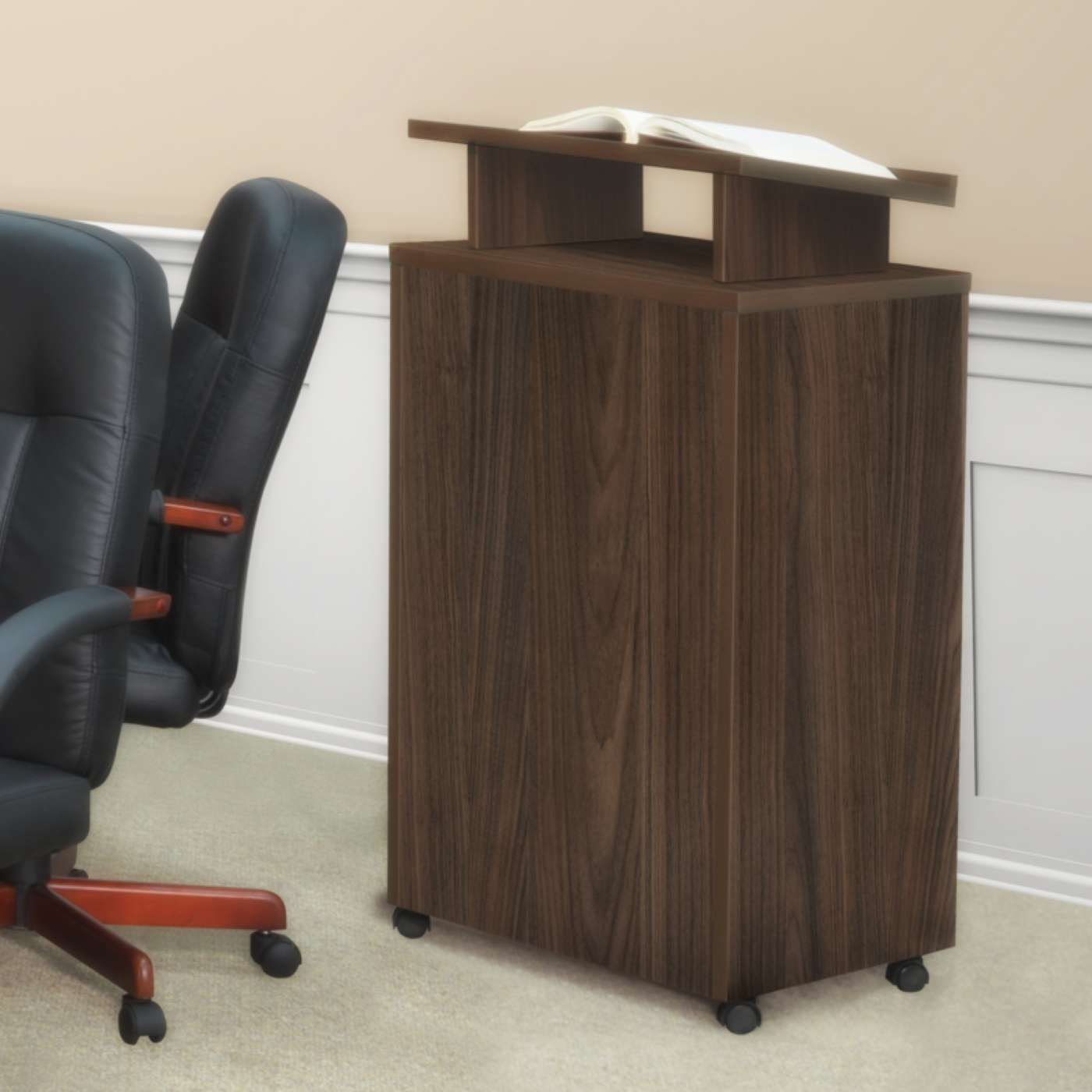 - Freestanding lectern moves on casters and can be placed anywhere in any room
