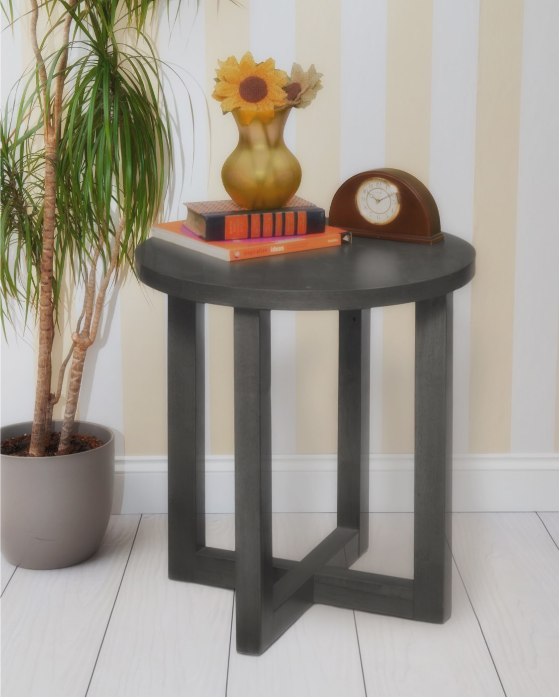 's Collection of occasional tables convey a simple idea that complements any room setting. This end table's straightforward design includes a modern X style base and elegant round top. It is constructed of 1-inch thick solid hardwood and is finished with a Grey hand-rubbed veneer. Stylish tables are at ease in both home and professional environments and look especially great in waiting rooms, entryways, in front of a sofa or lounge chair. Backed by a 1-year Limited Manufacturer's Warranty.Features for your benefit: