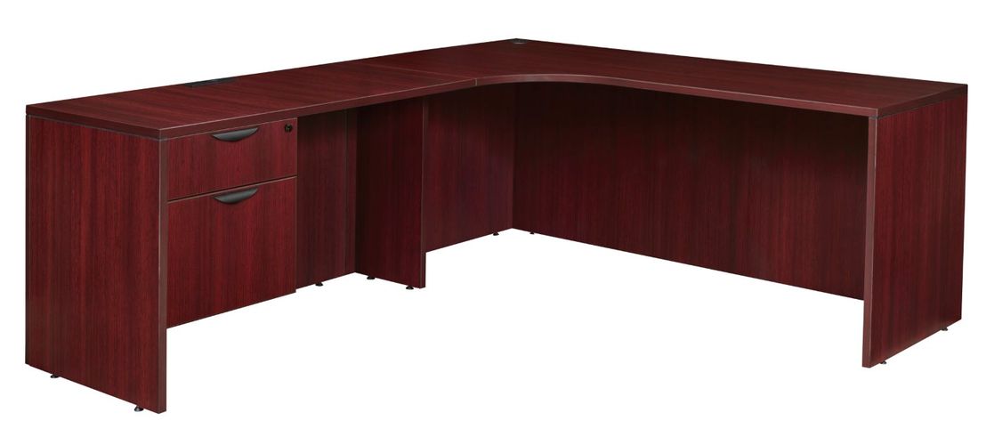 Versatility is just the beginning with so many desking options. This classic corner workstation has a curved center for a seamless transition between desk and return. On this Left Corner Credenza, the return attaches to the left hand side and it is not reversible. It comes with one box-file pedestal that has one box drawer and one file drawer that accepts both letter and legal filing. Both drawers lock and include ergonomically designed drawer pulls for convenience and ease in operation. Adjustable glides on the bottom of the base keep the desktop level and are easy to adjust. Wire management grommets keep cables clear of work areas. Finished in a classic Mahogany laminate, this desk coordinates with other furniture. The collection is constructed of a 1-inch thick thermal fused melamine laminate with a 3-millimeter commercial grade matching PVC edge. Laminates are scratch, stain and scald resistant. casegoods are backed by a 10-year limited manufacturer's warranty.Features for your benefit: