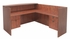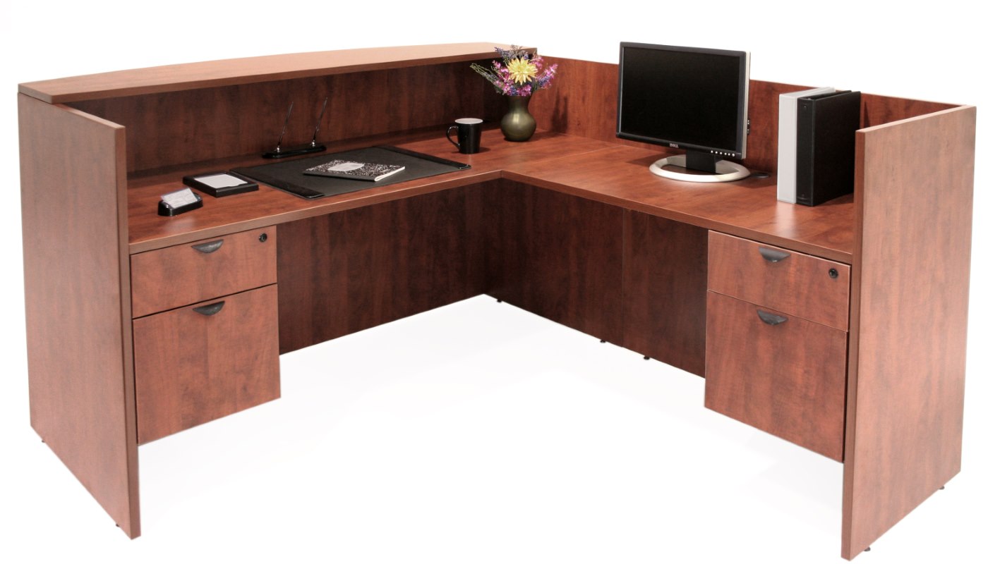 Greet visitors properly with the Reception Collection! This 71-inch long Reception desk comes with two box-file pedestals with locking drawers and ergonomically designed drawer pulls for convenience and ease in operation. Both file drawers accept both letter and legal filing while box drawers keep supplies handy. A transaction top stands at 42-inches high for guests' convenience and the wrap-around sides make for a more private work area. Wire management grommets keep cables clear of desktops. Adjustable glides on the bottom of the base keep the desktop level and are easy to adjust. Finished in an attractive Cherry laminate, the Reception Desk coordinates with other furniture which makes customizing easy. The collection is constructed of a 1-inch thick thermal fused melamine laminate with a 3-millimeter commercial grade matching PVC edge. Laminates are scratch, stain and scald resistant. casegoods are backed by a 10-year limited manufacturer's warranty.Features for your benefit: