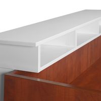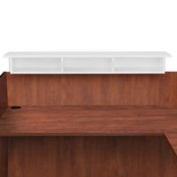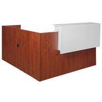 Greet visitors properly with the Reception Collection! This 71-inch long Reception desk comes with two box-file pedestals with locking drawers and ergonomically designed drawer pulls for convenience and ease in operation. Both file drawers accept both letter and legal filing while box drawers keep supplies handy. A transaction top stands at 47-inches high for guests' convenience and the wrap-around sides make for a more private work area. Wire management grommets keep cables clear of desktops. Adjustable glides on the bottom of the base keep the desktop level and are easy to adjust. Finished in an attractive Cherry laminate with a White transaction top, the Reception Desk coordinates with other furniture which makes customizing easy. The collection is constructed of a 1-inch thick thermal fused melamine laminate with a 3-millimeter commercial grade matching PVC edge. Laminates are scratch, stain and scald resistant. casegoods are backed by a 10-year limited manufacturer's warranty.Features for your benefit: