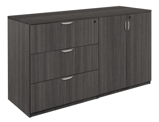 Sit or stand in the comfort of Stand Up modular workstations- perfect for a mailroom, break area or any collaborative environment. Fast paced environments beg for productivity and with standing storage units, everything is within arms' length. Stand up group stations offer a large surface perfect for blueprints for common work space. This Stand Up set includes one Stand Up Storage Cabinet and one Stand Up Lateral File placed side-to-side. The individual components can be placed in any order within the grouping. The Lateral File includes three large locking full suspension file drawers that accept both letter and legal filing. The Storage Cabinet has two locking doors that open to a spacious interior with two adjustable shelves that can be moved in 1-inch increments. Finished in an stylish Ash Grey laminate, Stand Up components coordinate with other furniture which makes customizing easy. The collection is constructed of a 1-inch thick thermal fused melamine laminate with a 3-millimeter commercial grade matching PVC edge. Laminates are scratch, stain and scald resistant. casegoods are backed by a 10-year limited manufacturer's warranty.Features for your benefit:
