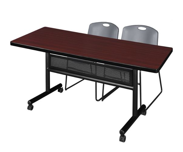 Set up a meeting room in a flash with Flip Top Tables. Unlock the quick-release lever and flip down the entire tabletop to nest together when not in use. Perfect for rooms with variable class size, the Flip Top tables save set up time and storage space. This set includes one 72" x 30" Flip Top table with Modesty Panel and two Grey Stack Chairs. The table is constructed of a thermal fused melamine laminate tabletop that is 1-inch thick and finished with a black T-Mold edge band. This Mahogany tabletop is double-sided and finished in Mocha Walnut on the other side. Simply pick the side you like and install the base on the other. Self tapping wood screws and a placement template are included. Laminates are scratch, stain and scald resistant and wipe clean easily. Rounded corners make the table safer for everyone. The base is constructed of black tubular steel. Locking casters make these tables mobile and are ideal for computer labs, training rooms, classrooms and more. 's Patent-Pending stack chair is not only unique, but durable, sturdy and versatile as well. The seat and back are treated with an anti-microbial agent, which makes it perfect for schools, waiting rooms, cafeterias and more. A reinforced black metal frame is designed to support up to 400lbs and a built in handle makes moving the chair easier. All chairs are backed by a 5-year limited manufacturer's warranty on chair bases and frames and a 2-year limited manufacturer's warranty on chair mechanisms and upholstery. tables are backed by a 10-Year Limited Manufacturer's Warranty.Features for your benefit: