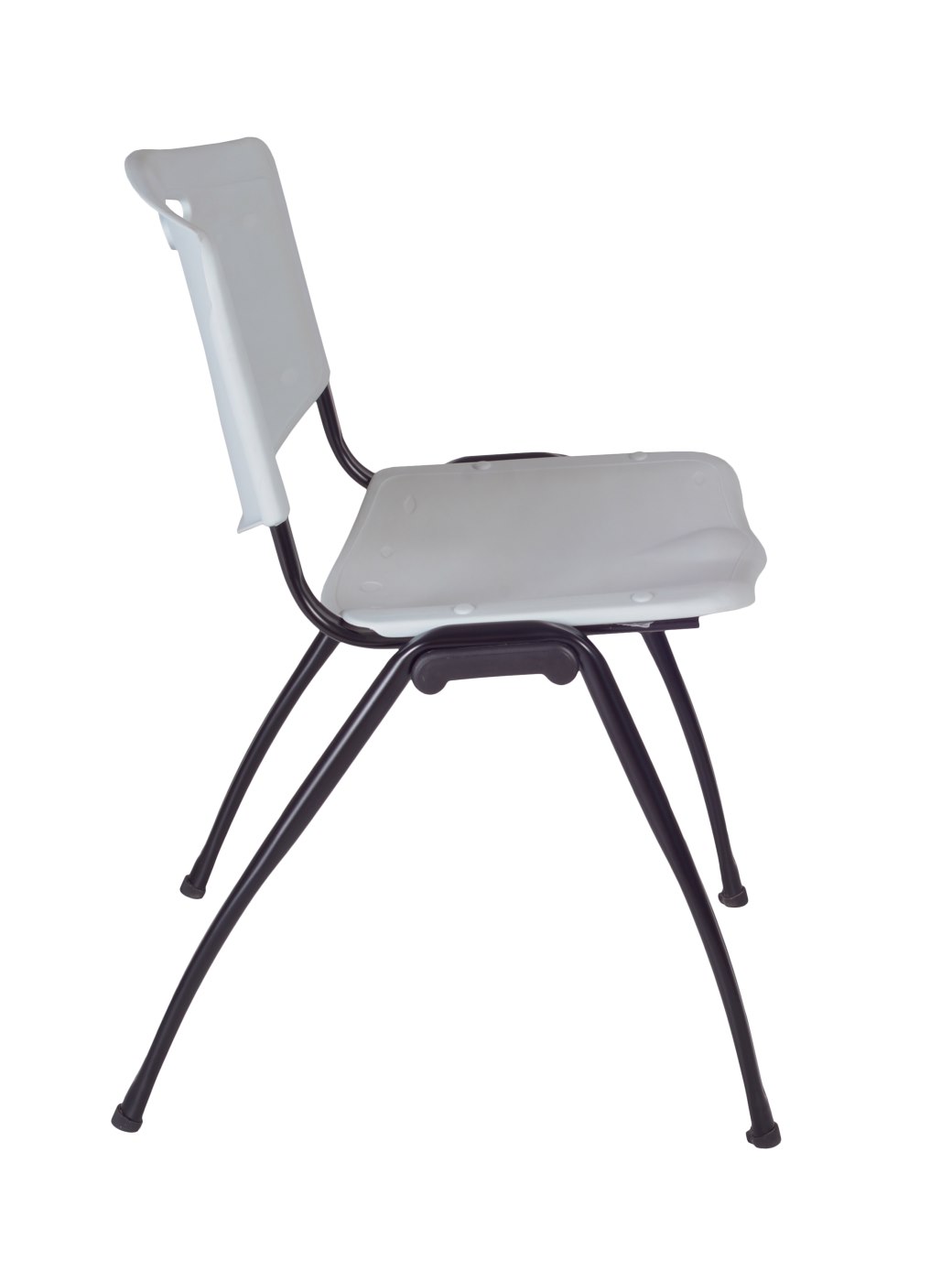 - "M" stack chairs have a black metal frame and contoured plastic seat and back with built-in carrying handle