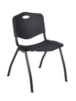 - "M" stack chairs have a black metal frame and contoured plastic seat and back with built-in carrying handle