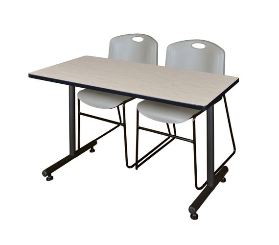 The elegant collection puts the class in classroom. These versatile tables are at home in stylish restaurant settings as well as classrooms, breakrooms and more. This set includes one 48-inch long training table and two Grey Stack Chairs. The table is constructed of a thermal fused melamine laminate tabletop that is 1-inch thick and finished with a black T-Mold edge band. This Maple tabletop is double-sided and finished in Cherry on the other side. Rounded corners make the table safer for everyone. Simply pick the side you like and install the base on the other. Self tapping wood screws and a placement template are included. Laminates are scratch, stain and scald resistant and wipe clean easily. The base is constructed of a black tubular steel T-Base and is protected with a black powder coated finish for a uniform, matte finish. Adjustable glides on the bottom that raise the whole base off the ground give the collection an open, modern look. 's Patent-Pending stack chair is not only unique, but durable, sturdy and versatile as well. The seat and back are treated with an anti-microbial agent, which makes it perfect for schools, waiting rooms, cafeterias and more. A reinforced black metal frame is designed to support up to 400lbs and a built in handle makes moving the chair easier. All chairs are backed by a 5-year limited manufacturer's warranty on chair bases and frames and a 2-year limited manufacturer's warranty on chair mechanisms and upholstery. tables are backed by a 10-Year Limited Manufacturer's Warranty.Features for your benefit: