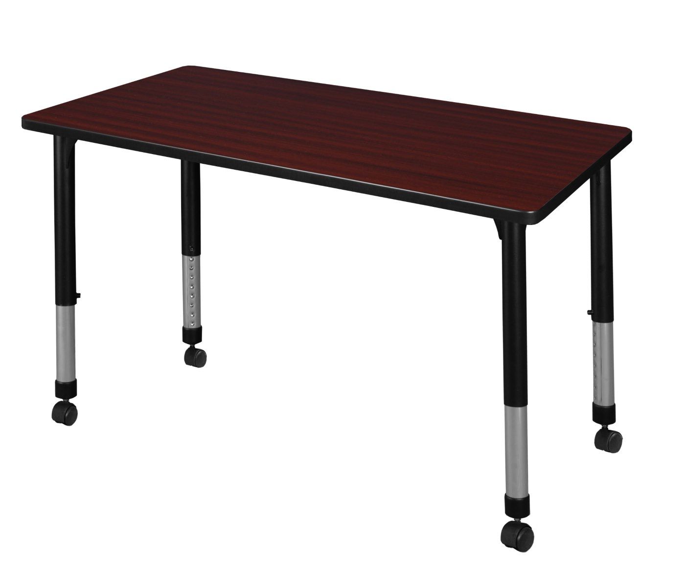 Give everyone more room with tables. Mobile classroom table sets include four height adjustable post legs and casters to accommodate students of all ages. Setting up a Classroom has never been easier! Height is easy for adults to adjust by loosening and tightening a bolt with the included hex key. This 42-inch long classroom table assembles in a snap with just a few screws. The table is constructed of a thermal fused melamine laminate tabletop that is 1-inch thick and finished with a black T-Mold edge band. This Mahogany tabletop is double-sided and finished in Mocha Walnut on the other side. Simply pick the side you like and install the base on the other. Self tapping wood screws and a placement template are included. Laminates are scratch, stain and scald resistant and wipe clean easily. Rounded corners make the table safer for everyone. A sleek alternative to pedestal style bases, the adjustable post legs come in a classic black with chrome underneath. Adjustable glides on the bottom of the base ensure a level tabletop and are easy to adjust.Features for your benefit: