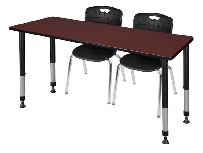 Give everyone more room with tables. This set comes with one 72" x 24" Rectangle Table and two Black Andy 18-in Stack Chairs. adjustable post legs come four to a set and are height adjustable to accommodate students of all ages. Height is easy for adults to adjust by loosening and tightening a bolt with the included hex key. This 72-inch long classroom table assembles in a snap with just a few screws. The table is constructed of a thermal fused melamine laminate tabletop that is 1-inch thick and finished with a black T-Mold edge band. This Mahogany tabletop is double-sided and finished in Mocha Walnut on the other side. Simply pick the side you like and install the base on the other. Self tapping wood screws and a placement template are included. Laminates are scratch, stain and scald resistant and wipe clean easily. Rounded corners make the table safer for everyone. A sleek alternative to pedestal style bases, the adjustable post legs come in a classic black with chrome underneath. Adjustable glides on the bottom of the base ensure a level tabletop and are easy to adjust. The stylish and durable Andy stack chair is ideal for classrooms, breakrooms and more. It is constructed of a flexible and durable polypropylene seat and back and a chrome-colored tubular steel frame and stores away in stacks of 12. The Andy chair ships assembled and is ready to use immediately. All chairs are backed by a 5-year limited manufacturer's warranty on chair bases and frames and a 2-year limited manufacturer's warranty on chair mechanisms and upholstery.Features for your benefit: