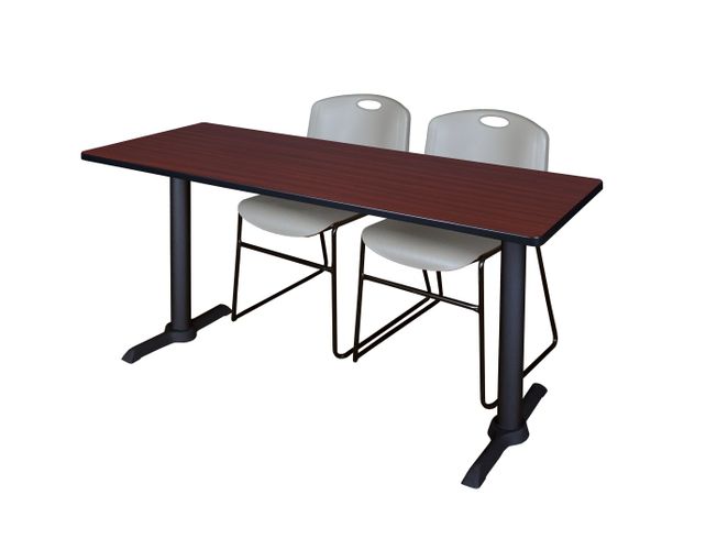 Whether you're planning a lounge, cafe, library, breakroom or restaurant, let the Collection take you there. These versatile tables are at home in stylish cafe or coffee shop settings as well as training rooms. This set includes a 72-inch training table and 2 Grey Stack Chairs. The table is constructed of a thermal fused melamine laminate tabletop that is 1-inch thick and finished with a black T-Mold edge band. This Mahogany tabletop is double-sided and finished in Mocha Walnut on the other side. Simply pick the side you like and install the base on the other. Self tapping wood screws and a placement template are included. Laminates are scratch, stain and scald resistant and wipe clean easily. Rounded corners make the table safer for everyone. The stylish T-Base legs are constructed of tubular steel posts and solid steel T-Bases. Hidden adjustable glides on the bottom of the base keep the legs and tabletop level and are easy to adjust. 's Patent-Pending stack chair is not only unique, but durable, sturdy and versatile as well. The seat and back are treated with an anti-microbial agent, which makes it perfect for schools, waiting rooms, cafeterias and more. A reinforced black metal frame is designed to support up to 400lbs and a built in handle makes moving the chair easier. All chairs are backed by a 5-year limited manufacturer's warranty on chair bases and frames and a 2-year limited manufacturer's warranty on chair mechanisms and upholstery. tables are backed by a 10-Year Limited Manufacturer's Warranty.Features for your benefit: