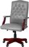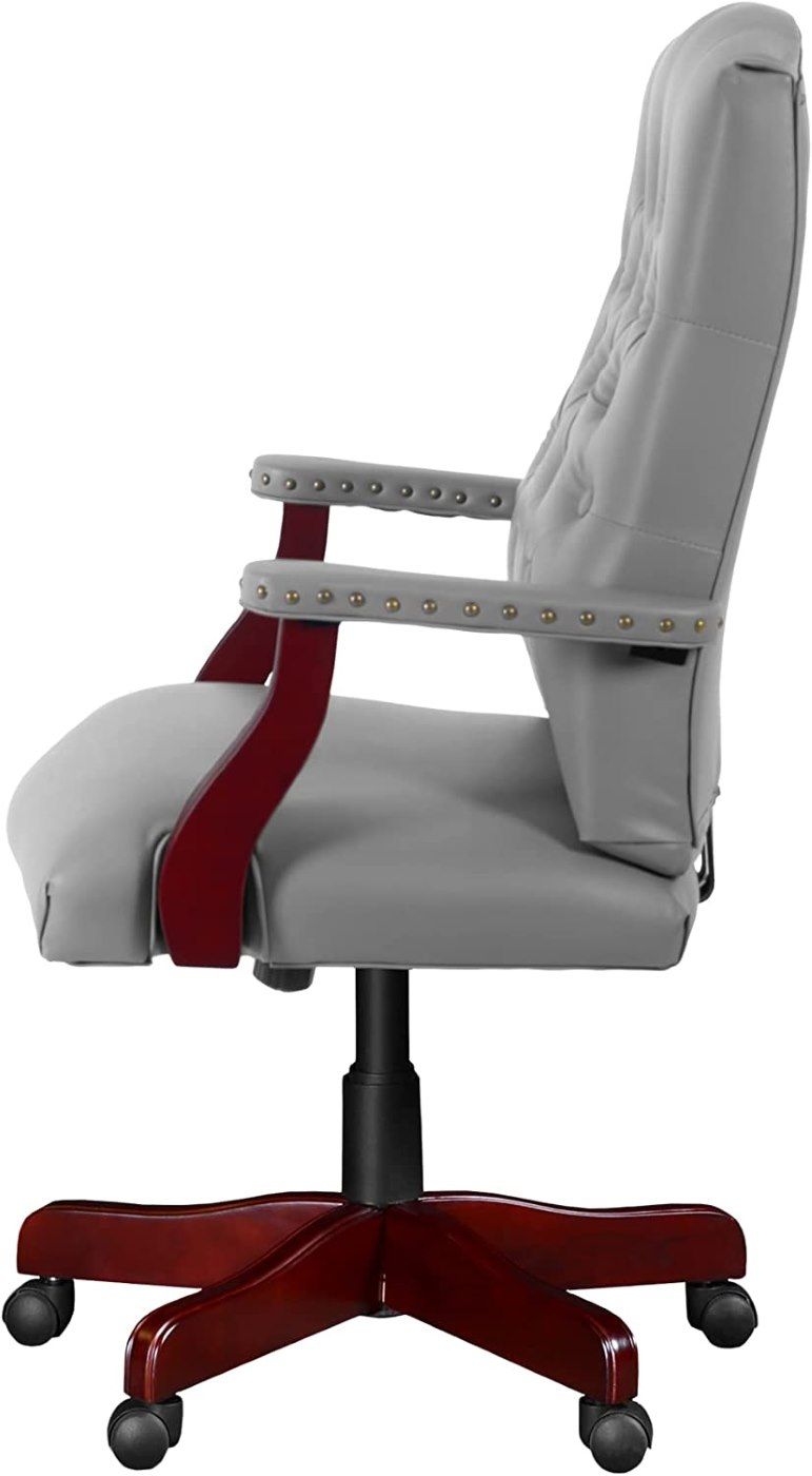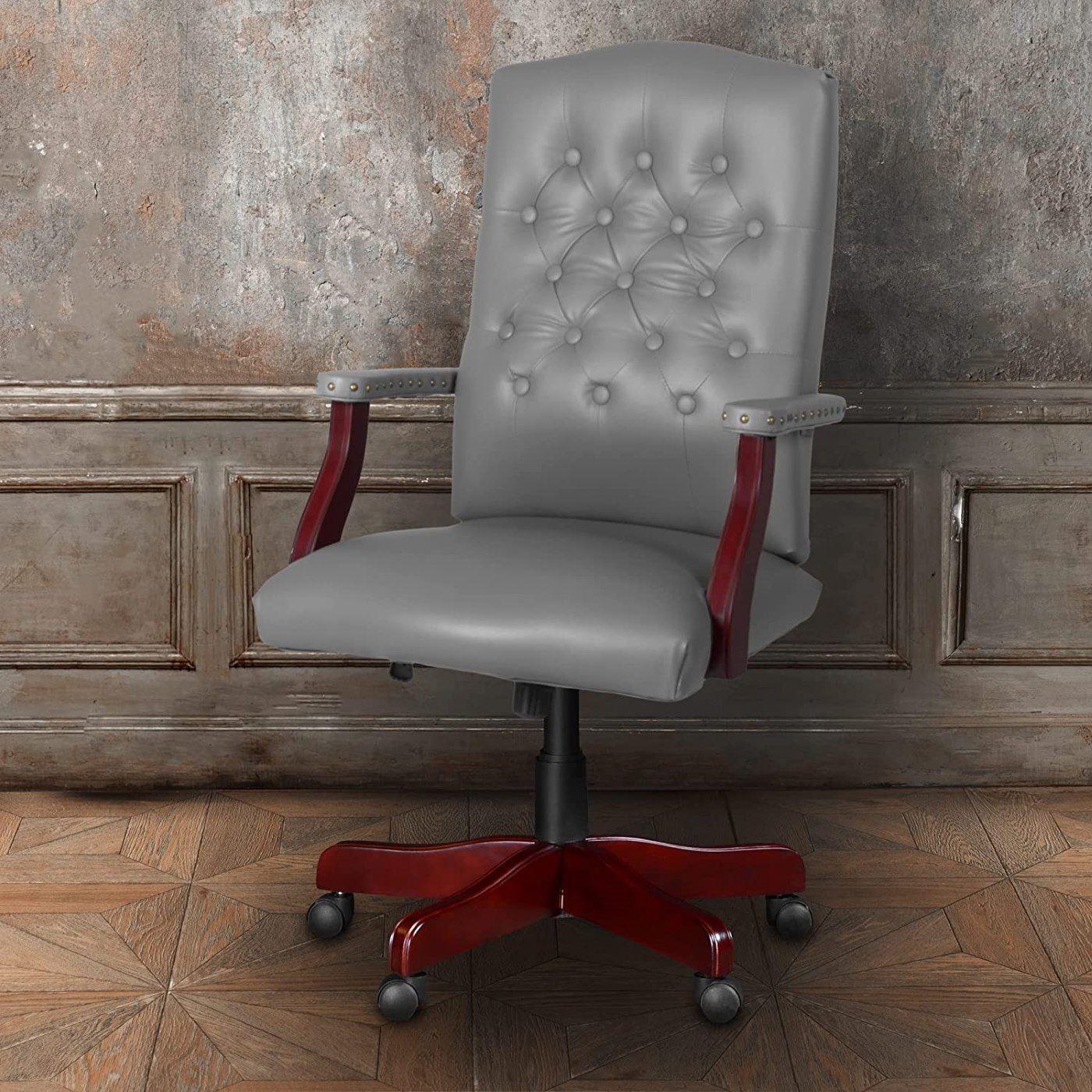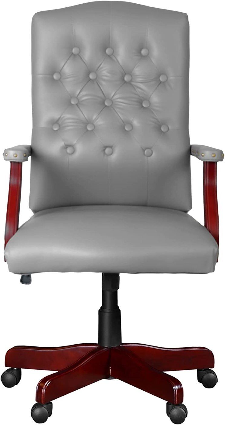 Bring an air of distinction to any traditional home or professional office setting. A beautiful hardwood Mahogany frame, timeless brass trim accents, durable vinyl upholstery and elegant button tuft stitching make the Swivel a must-have addition. Available in a Grey finish to match any decor. The chair looks great in libraries, studies and waiting rooms, too.Features & Specifications: