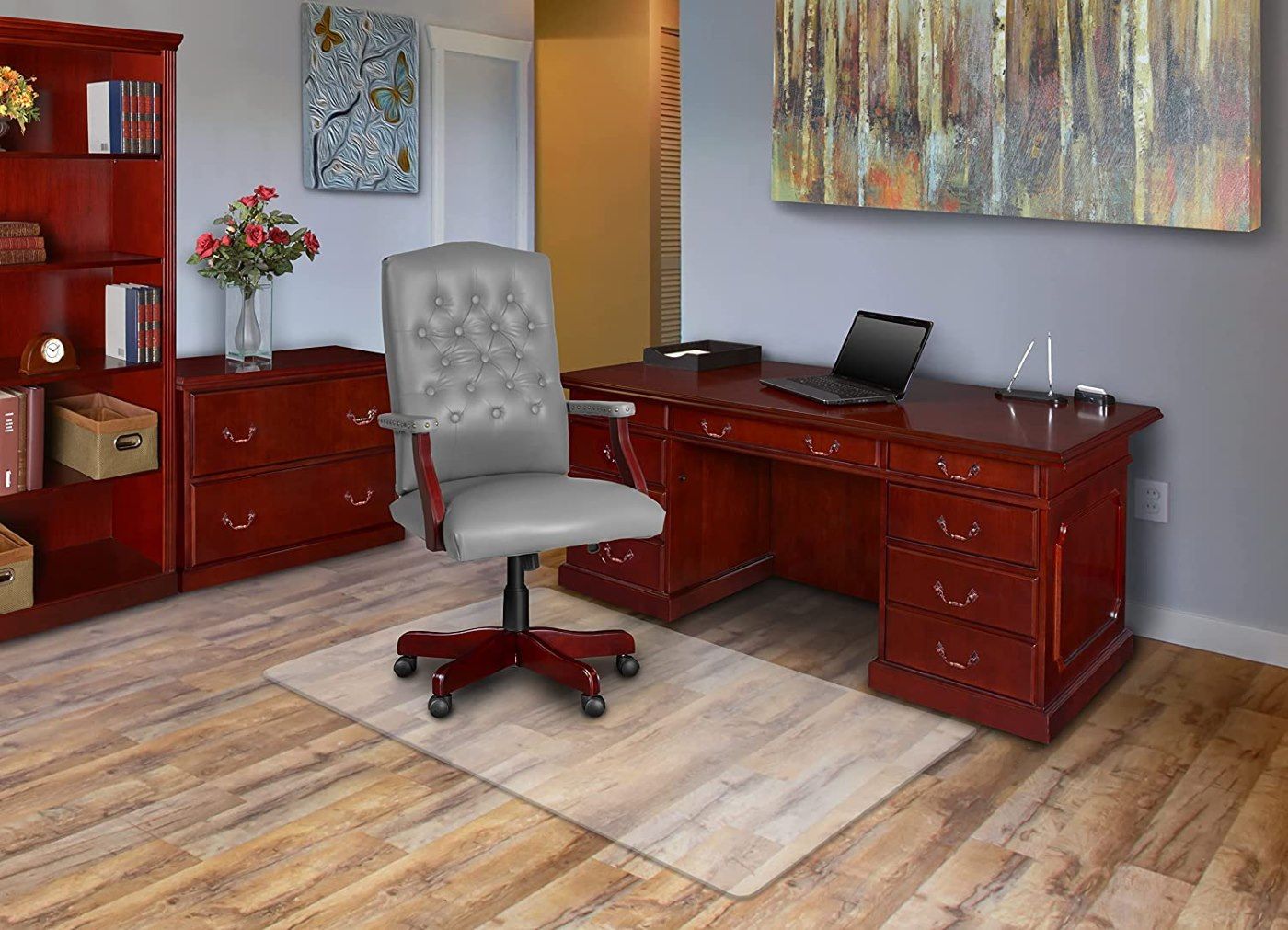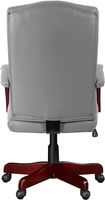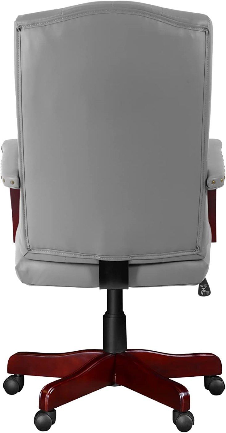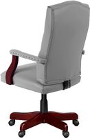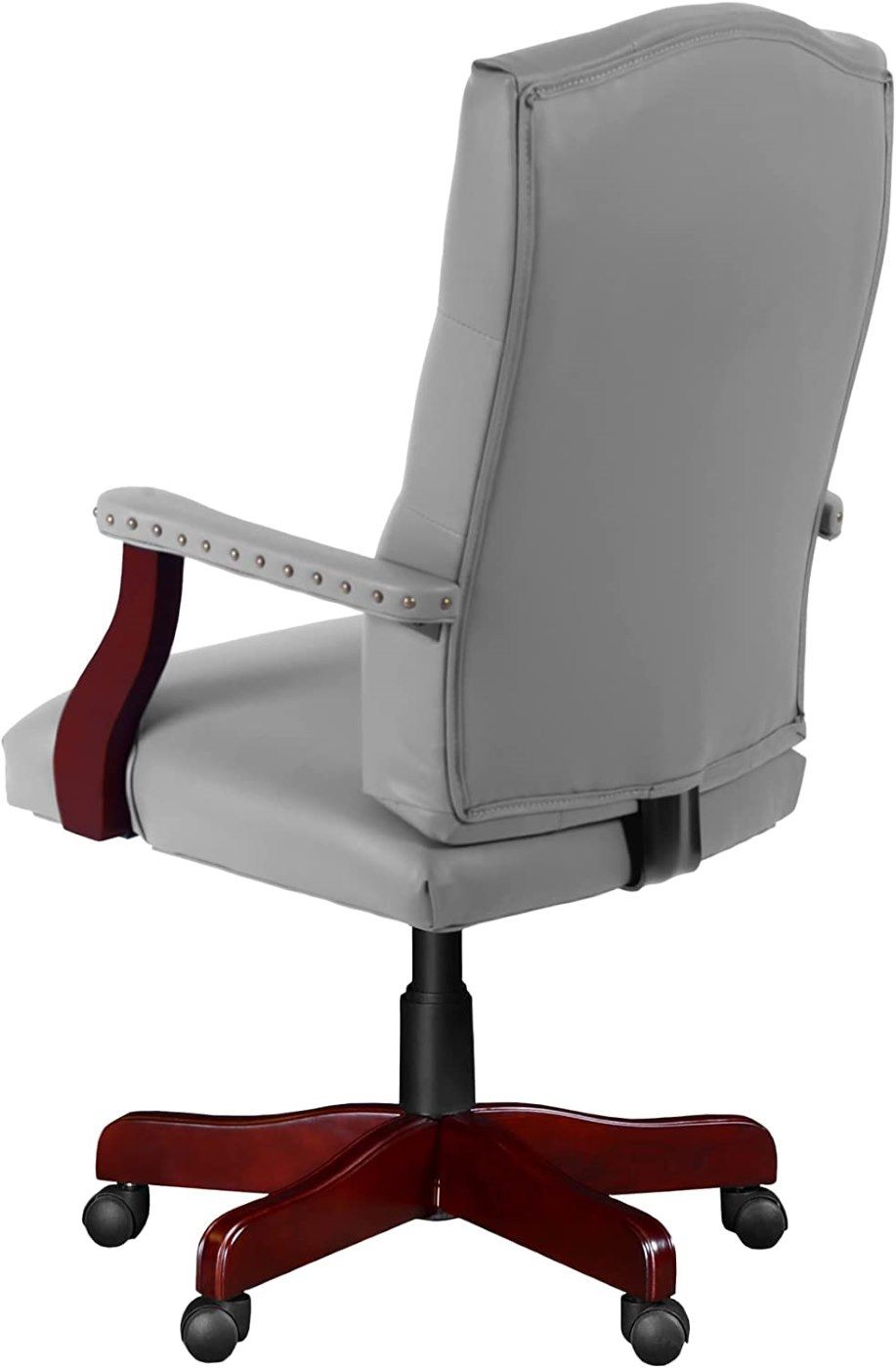 Bring an air of distinction to any traditional home or professional office setting. A beautiful hardwood Mahogany frame, timeless brass trim accents, durable vinyl upholstery and elegant button tuft stitching make the Swivel a must-have addition. Available in a Grey finish to match any decor. The chair looks great in libraries, studies and waiting rooms, too.Features & Specifications: