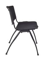 - "M" stack chairs have a black metal frame and contoured plastic seat and back with built-in carrying handle