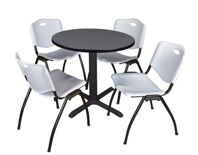Whether you're planning a lounge, cafe, library, breakroom or restaurant, let the Collection take you there. These versatile tables are at home in stylish cafe or coffee shop settings as well as lunch rooms. This set includes one 30-inch round table and four Grey "M" Stack Chairs. The table is constructed of a thermal fused melamine laminate tabletop that is 1-inch thick and finished with a black T-Mold edge band. This Grey tabletop is double-sided and finished in Beige on the other side. Simply pick the side you like and install the base on the other. Self tapping wood screws and a placement template are included. Laminates are scratch, stain and scald resistant and wipe clean easily. The stylish X-Base is constructed of a tubular steel post and solid steel X-Base. Hidden adjustable glides keep the tabletop level and are easy to adjust. The sturdy, lightweight "M" stack chair by offers durability, style and value. Its black metal frame and contoured plastic seat and back are strong and easy to clean. This versatile stack chair easily stores away in stacks of 12 and features a built in handle for easy mobility. All chairs are backed by a 5-year limited manufacturer's warranty on chair bases and frames and a 2-year limited manufacturer's warranty on chair mechanisms and upholstery. tables are backed by a 10-Year Limited Manufacturer's Warranty.Features for your benefit: